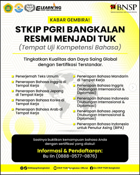 stkippgribangkalan Kampus STKIP PGRI Bangkalan kini telah resmi dapat digunakan sebagai TUK (Tempat Uji Kompetensi) untuk tes kompetensi multi bahasa dengan skema: